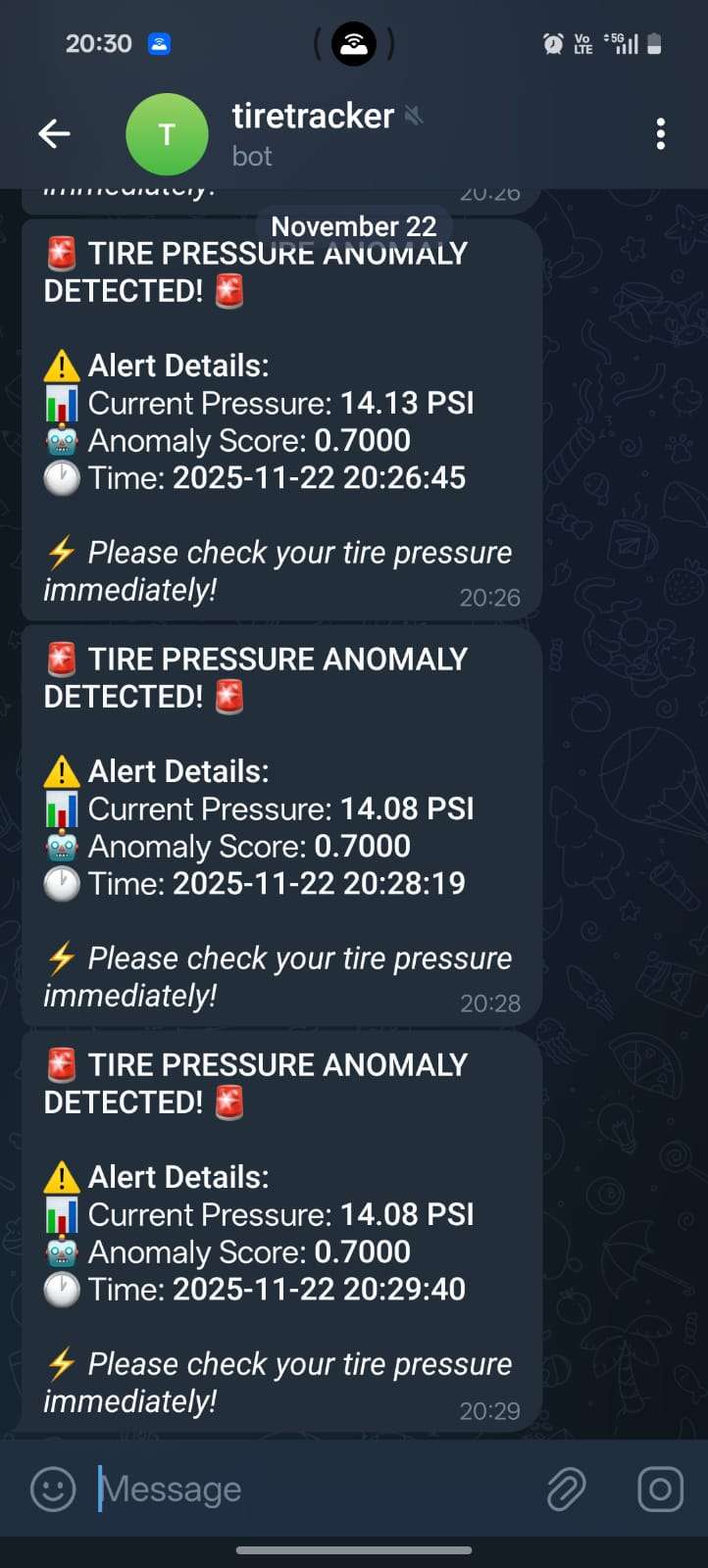 “Instant Telegram push notification alerting user of abnormal tire pressure event”