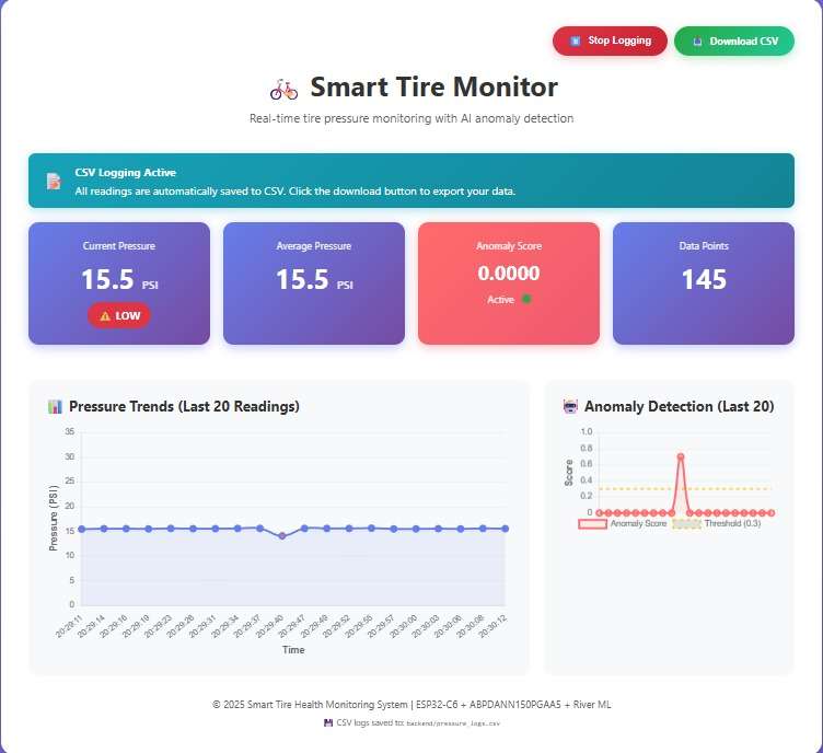 - "Smart Tire Monitor dashboard displaying real-time pressure and anomaly analytics”
