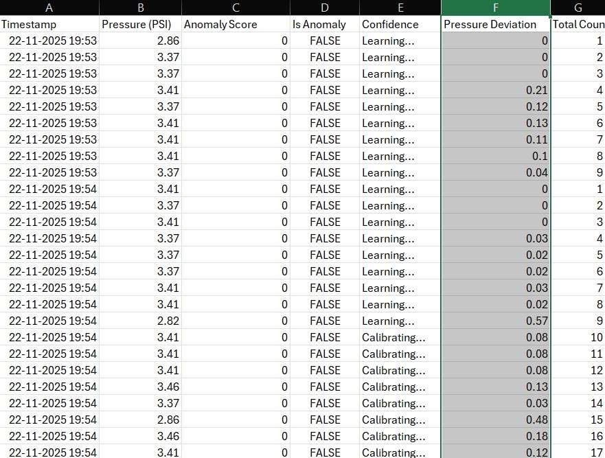 “Backend CSV log showing live pressure data, deviation tracking, and anomaly score”