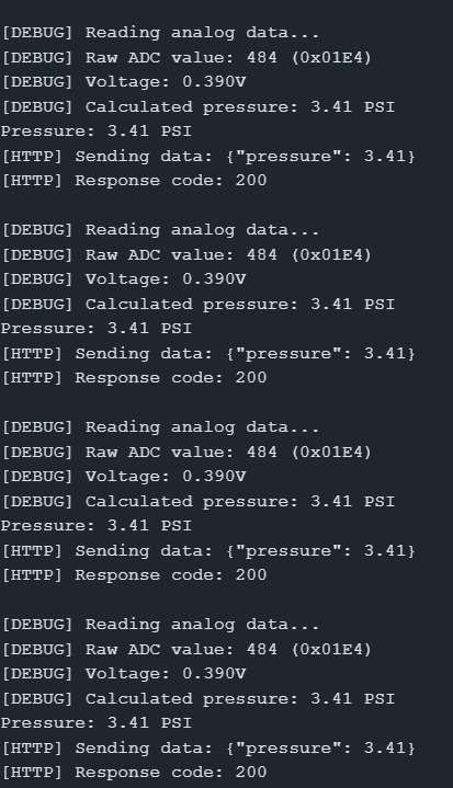 After pressure processing, the ESP32 transmits the PSI data every 2 seconds over Wi-Fi using HTTP POST requests to a locally hosted Flask backend API.