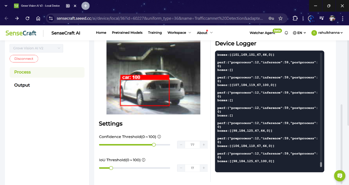 From the SenseCraft dashboard, the Vision AI device is detected automatically, allowing the user to select and deploy a pre-trained car detection model or train a custom classification model for “Car” and “No Car” classes. Sample images of the parking slot are captured directly from the live camera feed to build a small dataset, after which SenseCraft handles model training, optimization, and conversion for deployment on the module.