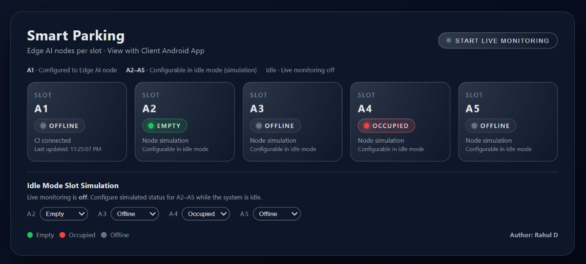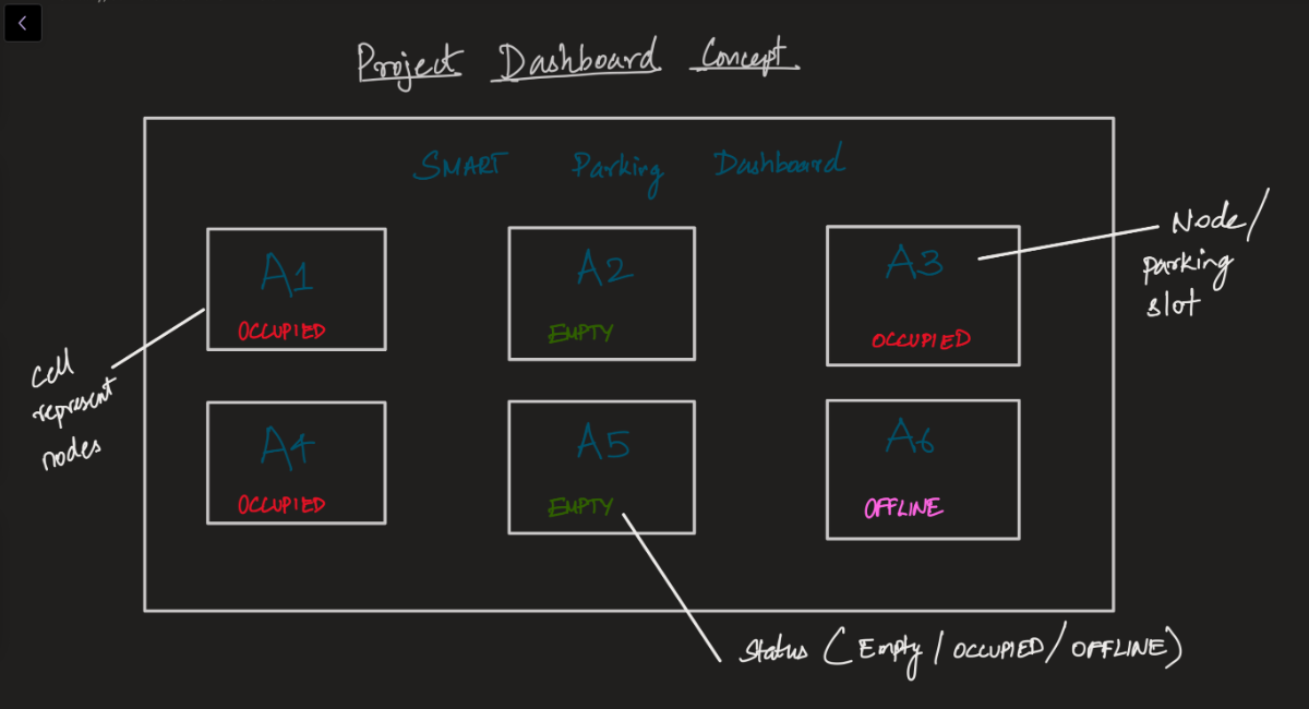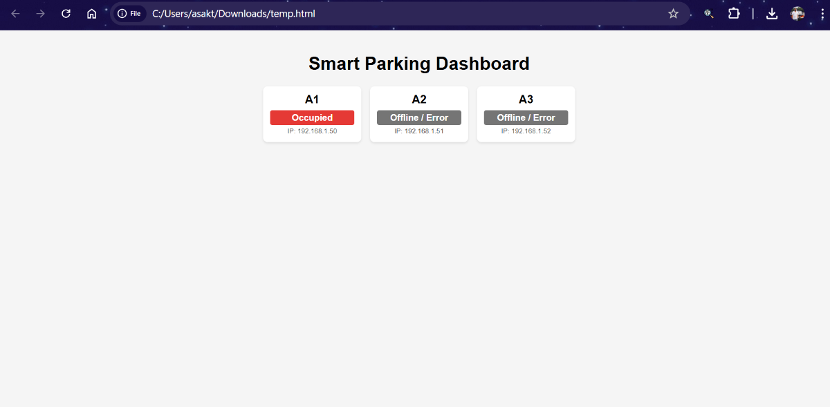 A separate Smart Parking web dashboard (running on a laptop/PC or simple web server) periodically polls all slot devices (A1, A2, A3, …) by their IP addresses and updates the UI. Each card on the dashboard turns red for occupied and green for empty, providing a live view of the entire parking lot.