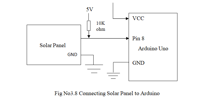 In receiver section solar panel is connected to pin 8 of Arduino UNO and also 5V with resistor 10k ohm and GND to ground. Arduino UNO board has VCC are connected to 5V, GND to ground.