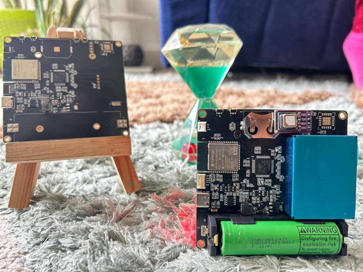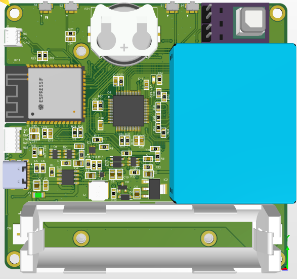 - Power: Li-ion battery + MAX17048 fuel gauge (I²C) or USB power