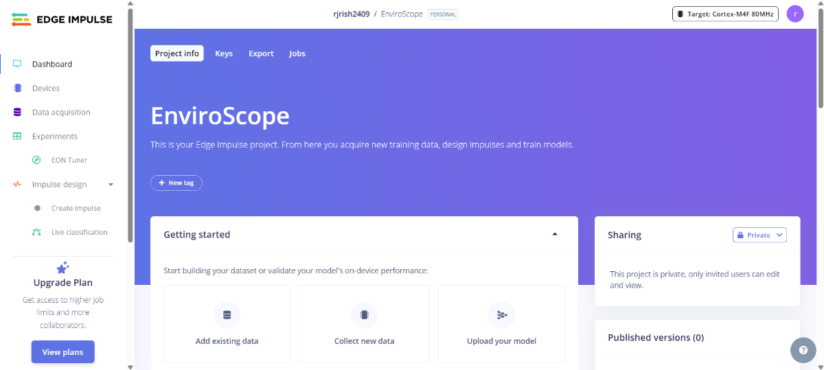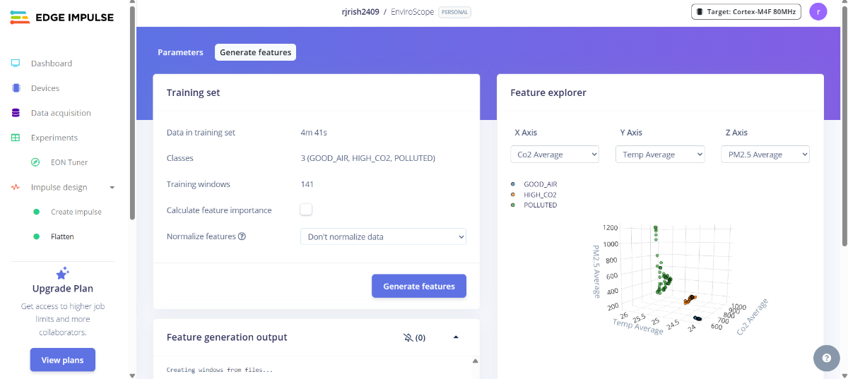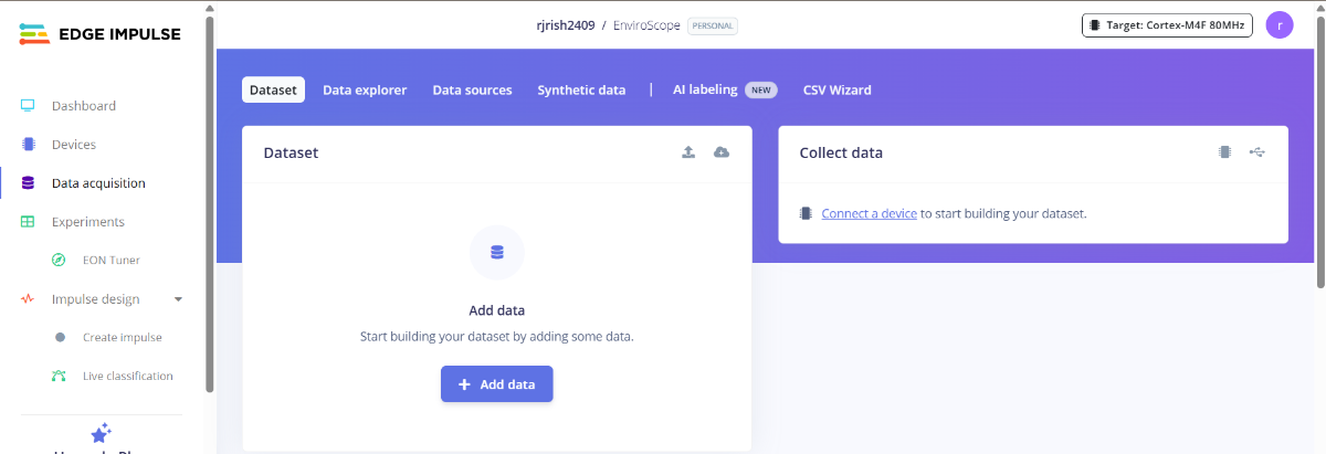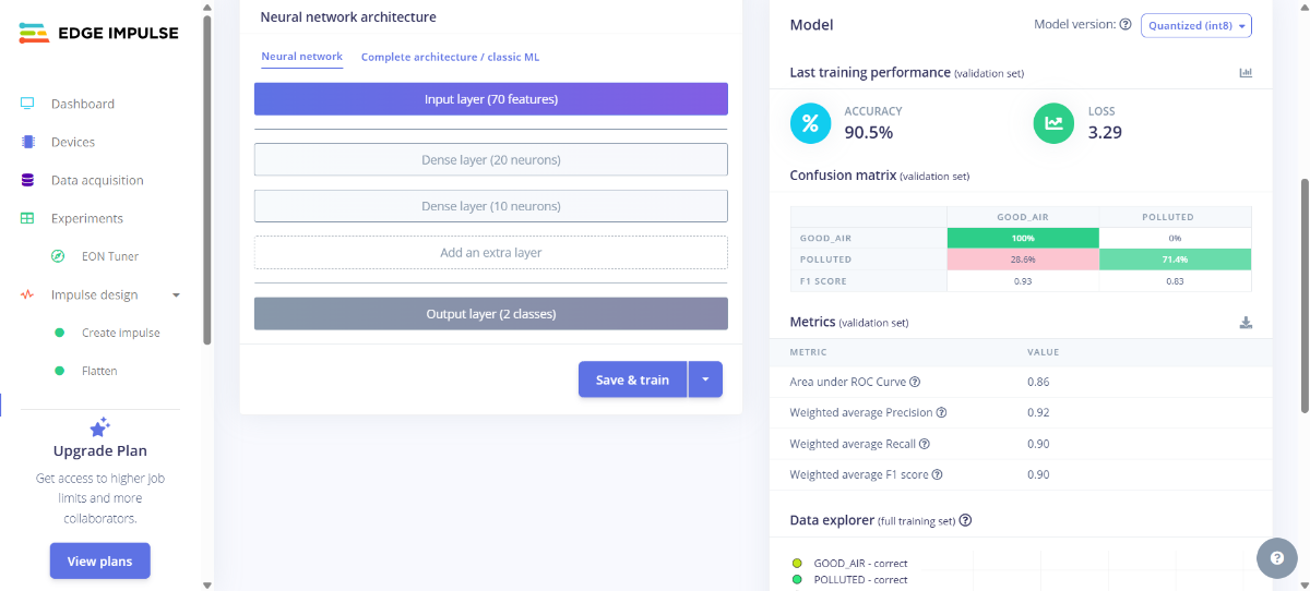 - Upload CSV to Edge Impulse → create an Impulse (flattened features) → train a small dense NN (32/16/8 + softmax).