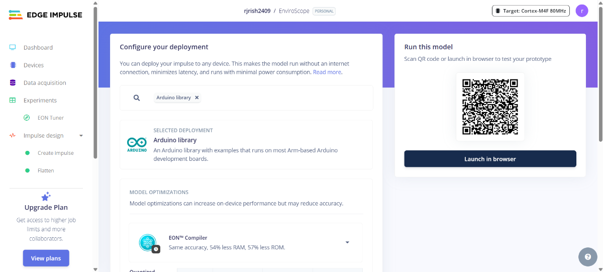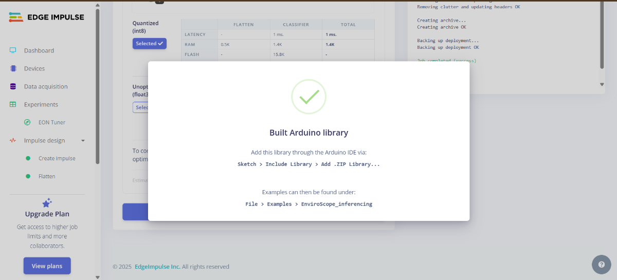 6. Select deployment as Arduino Library, build the model and the library will automatically downloaded on your system.