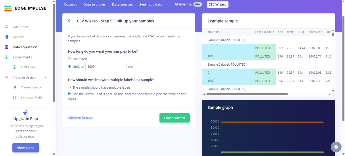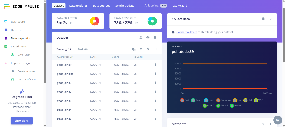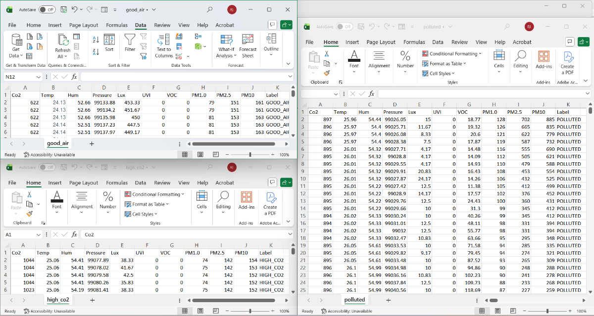 We are transferring all the sensor data to esp32-c6 over UART. Then formatting data in csv format. Take the sensor data in well vantilated room and label it as GOOD AIR, and then other set will be Polluted air label. As shown below: