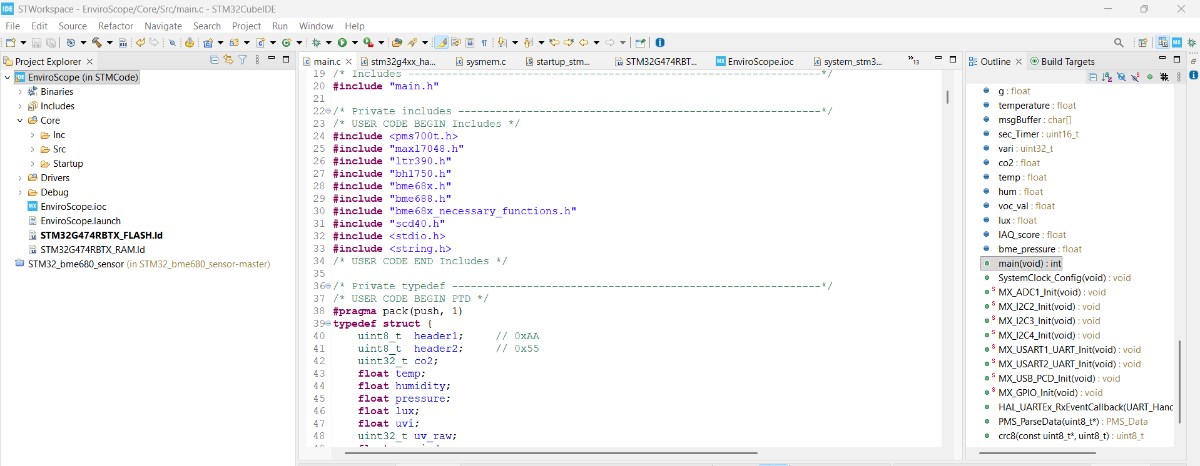 All environmental sensors are physically connected to the STM32G4 microcontroller, including: