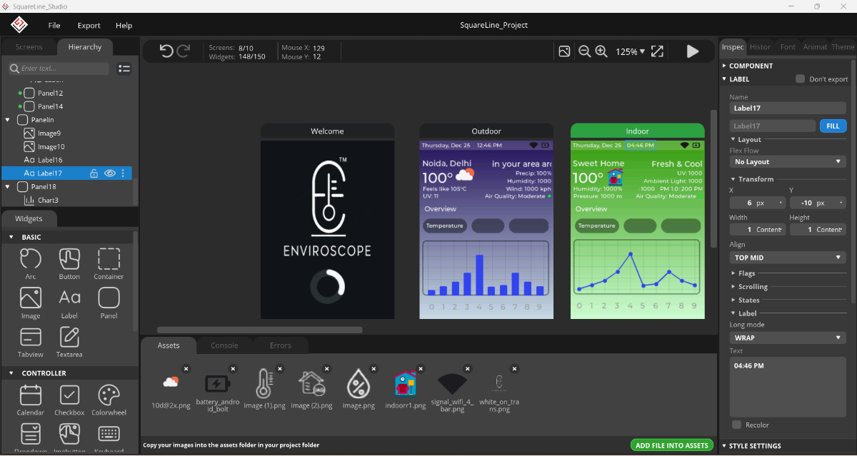 We have used Squareline Studio to design screens for the touch display. It supports LVGL library which is easy to port in ESP32 code. We have designed Welcome , Indoor and Outdoor Screen.