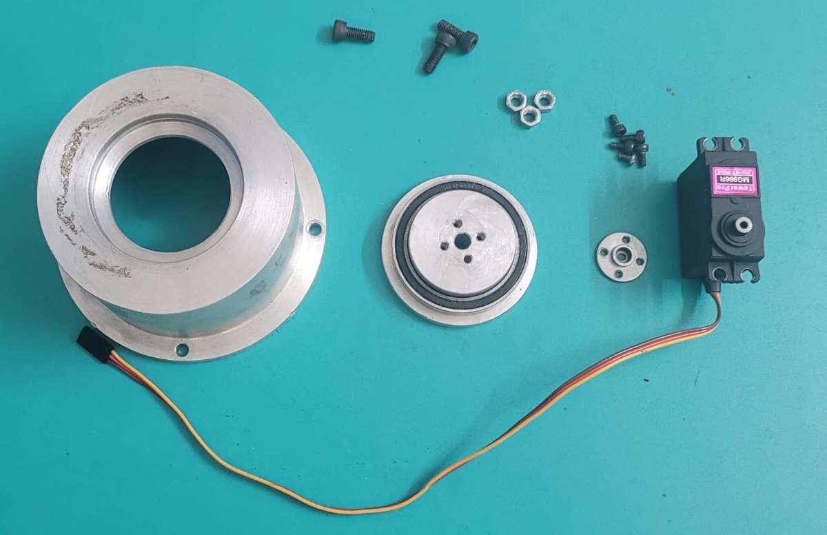 - The rotating base is equipped with a servo for precision rotation and is made using a Lathe Machine to create a circular rigid structure capable of providing the required stability. The second image provides an exploded view of the internal mecanism used for Arm rotation.