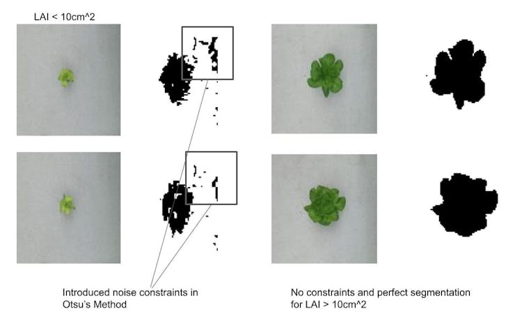 The Leaf Area Index or Biomass for each plant was calculated using image segmentation which was achieved by using the adaptive threshold method for the color information, specifically the Otsu Threshold, followed by a floodfill algorithm in OpenCV and finally using pixel-by-pixel segmented area calculation methods. This pipeline is illustrated below: