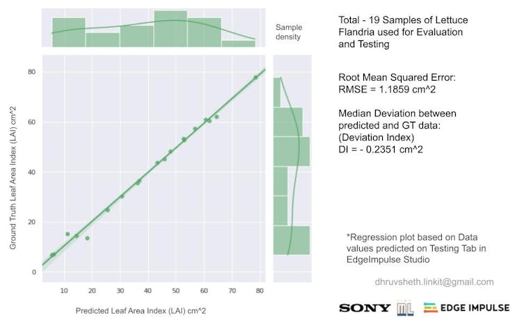 After the model training and data analysis of the segmented labels has been completed, the values predicted from the Regression model trained in EdgeImpulse Studio can be tested to evaluate efficacy on unseen test data. The model performs with near stellar accuracy on testing data evaluation in EdgeImpulse Studio. A test dataset of 19 samples with unique values from 5cm^2 to 90cm^2 LAI is fed to the model. The model evaluates the image data without the input of labels and proposes it's predictions. The predictions within a mean deviation of around 5cm^2. The maximum deviation or error rate withing limited cluster where it's predicted accurate is -4.78. On an average Lettuce Flandria observed much better performance than Lettuce Tiberius. The RMSE calculated for Lettuce Flandria was found out to be 1.185954306 cm^2. The RMSE is calculated using the metrices described below: