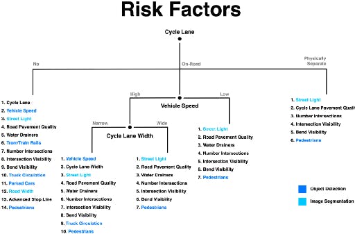 The most unsafe situation was the absence of cycle lane. Secondly, high speed limits with a narrow lane in an on-road scenario. Thirdly, high-speed limits but with a wider lane. Fourthly, low-speed limits regardless of the presence of a narrow or wide on-road lane. Finally, a physically separated lane was considered the safest scenario. In the next two sections are described the tools used to capture objects and structures from imagery.