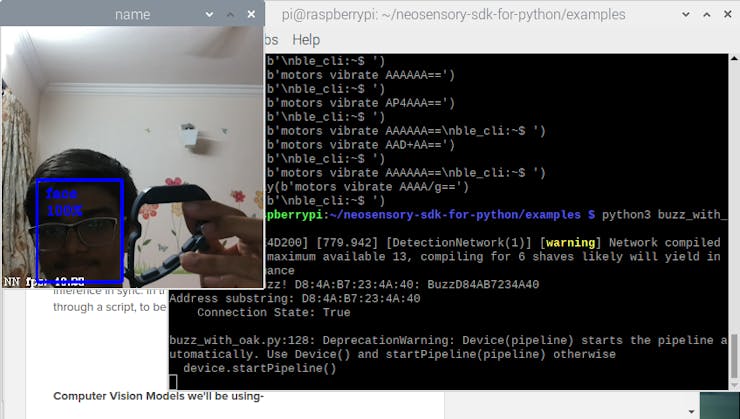 OAK-D needs a host device for OS support and to initialise scripts, examples and commands sent to be computed over the board. This host could be an ESP-32 or an laptop or even a Raspberry Pi. Personally, the compact form of Raspberry Pi has always been adored, and so I chose a Raspberry Pi 4B as the host device for OAK-D. The Raspberry Pi has built in bluetooth system, perfect to be connected to the Neosensory Buzz. Connecting the OAK-D to the Neosensory Buzz via Neosensory Python SDK was pretty straightforward, and apart from a few pitfalls while setting up, the overall process was quite smooth!