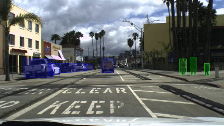 An example of the pedestrian and vehicle adas model inference results on an example image -