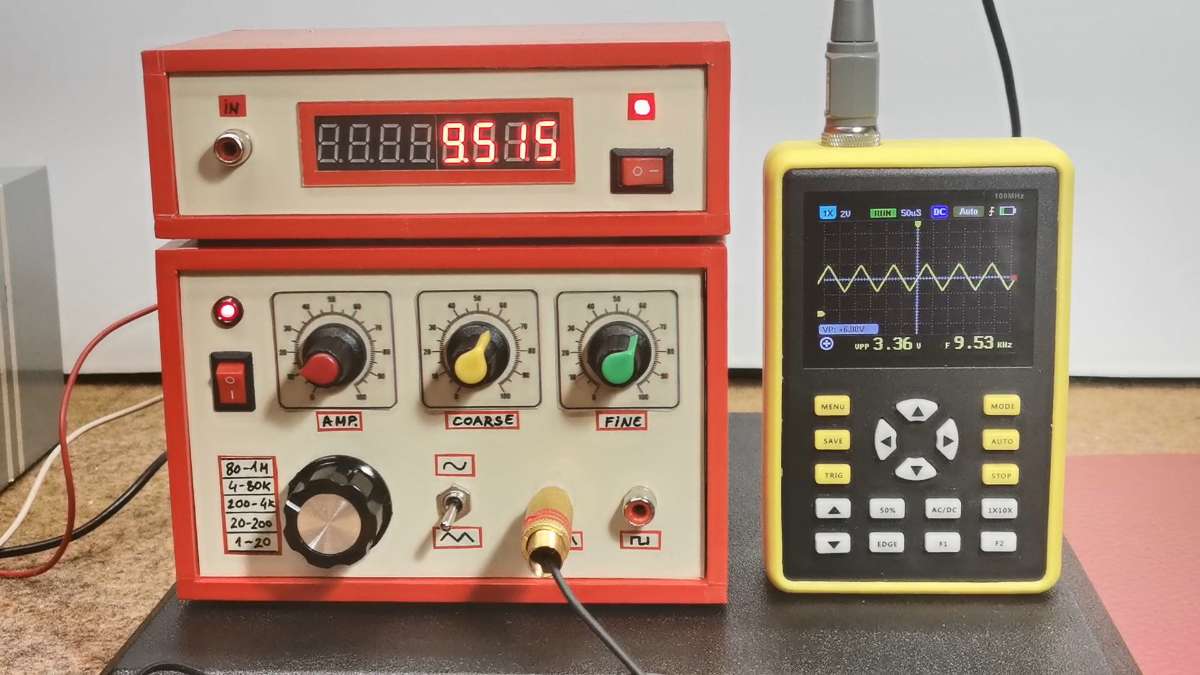 Here is what this module looks like mounted in a larger housing with a clear and easy-to-understand front panel for easier operation. I replaced the jumpers with a switch for selecting the frequency range as well as a switch for selecting between a sine and triangle signal on the corresponding output. Of course, there are also potentiometers for amplification, coarse and fine tuning of the generated frequency.