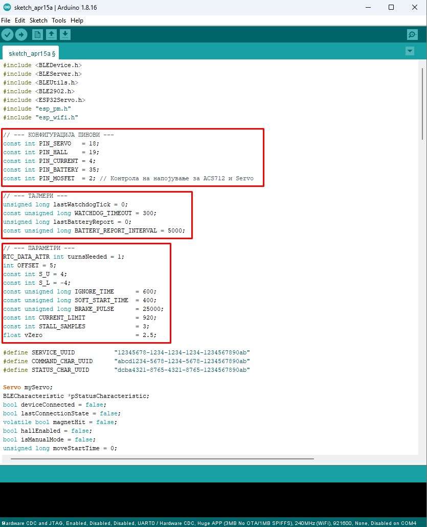 This is a crucial requirement in this type of development project, because very often when testing and changing components, quick changes need to be made to the code. I will describe all the variables that can be changed directly, as well as their functions in the circuit: