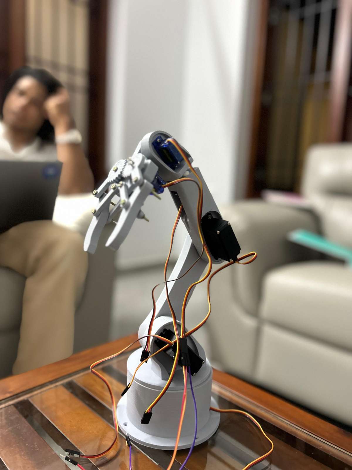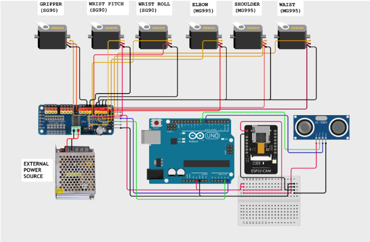 The Arduino R4 wifi is the central brain. It takes the classification data from YOLO and distance measurements from the ultrasonic sensor. It then uses inverse kinematics to calculate and send precise motion instructions to all six servo motors, enabling the robotic arm to pick the item and place it in the correct bin.