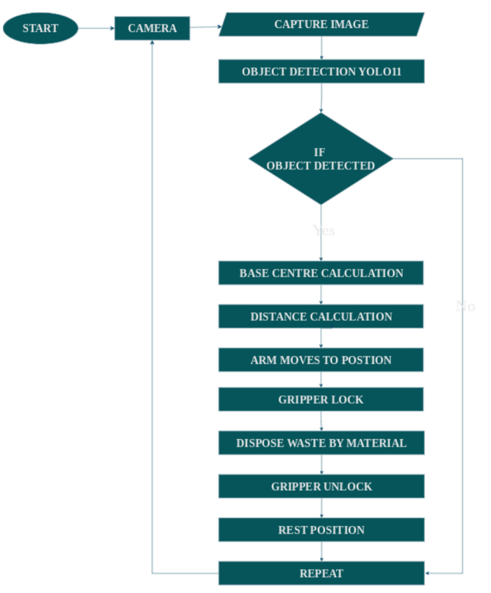 In this project, we have developed a 6-DoF Robotic Arm that can recognise different kinds of objects based on their material type and sort them accordingly. This is done with the help of fine-tuned YOLO11 with precise servo control to create an automated waste management solution.