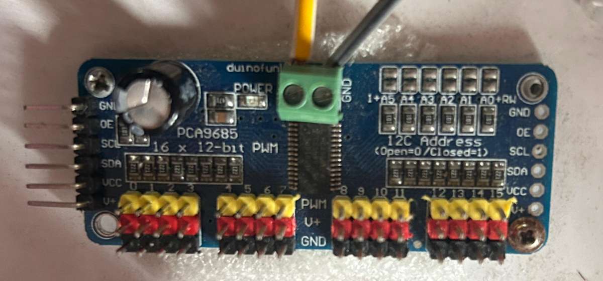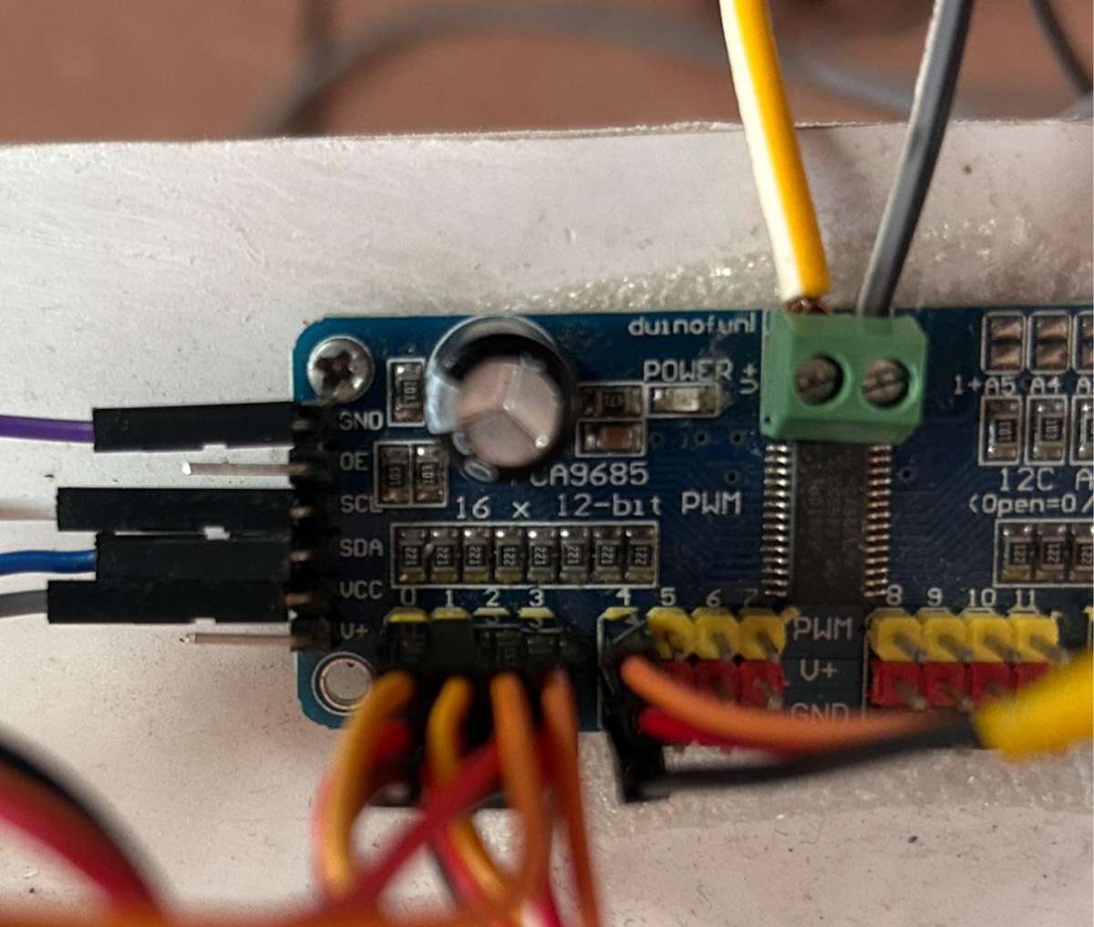 Finally, the Servo Driver Board is connected to the Arduino via I2C communication, by connecting the board's SDA pin to the Arduino's SDA pin (A5) and the board's SCL pin to the Arduino's SCL pin (A4), along with a shared GND connection. This Configuration allows the Arduino to command the six motors efficiently while isolating them from the high current draw of the external power supply.