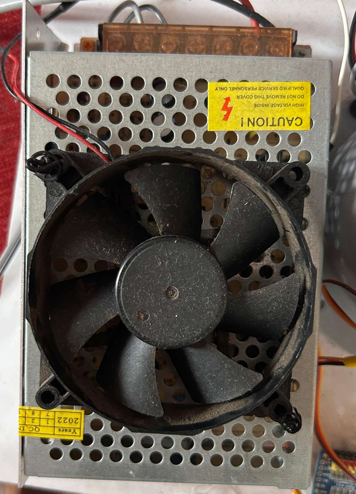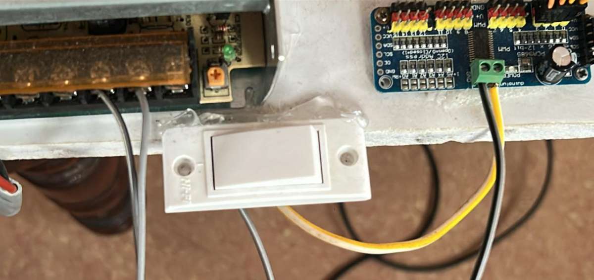 The connection process begins by ensuring the 5V 10A SMPS is unplugged for safety. The high current output from the SMPS is connected directly to the PCA9685 Servo Driver Board by linking the positive 5V output to the board's V+ terminal and the Ground output to the board's GND terminal. We used a switch here as a fail-safe.