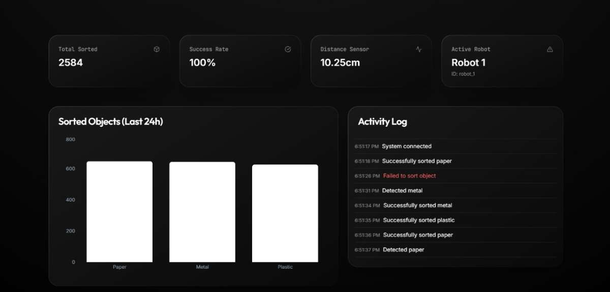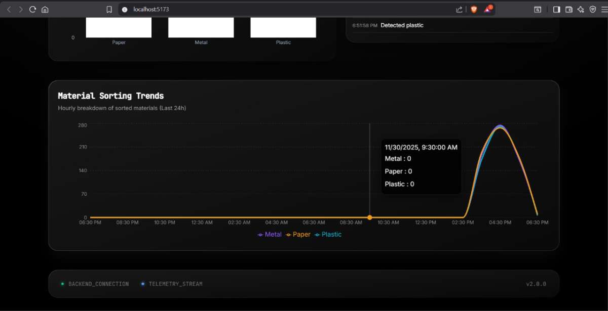 The dashboard is made with ReactJS. This dashboard gives real-time data on the sorted objects, and by using Apache Kafka, data can be moved between systems in real time. it acts as a high-speed stream that streams massive amounts of data like logs, sensor readings etc, instantly in real-time.