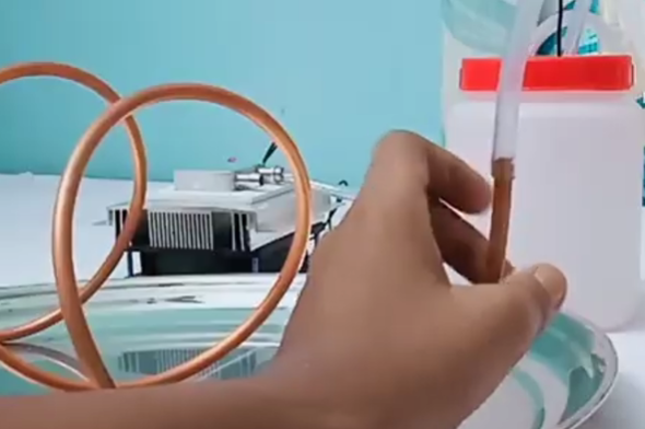 - Connect the plastic pipe to the outlet of the motor pump and route it towards the coiled copper tube.