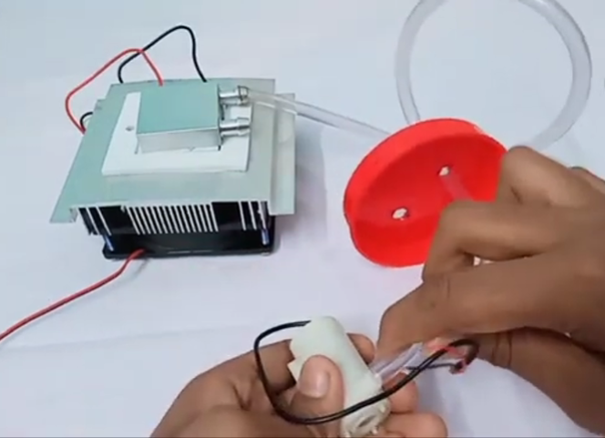 - Connect the Peltier module, exhaust fan, motor pump, and battery according to the circuit diagram.