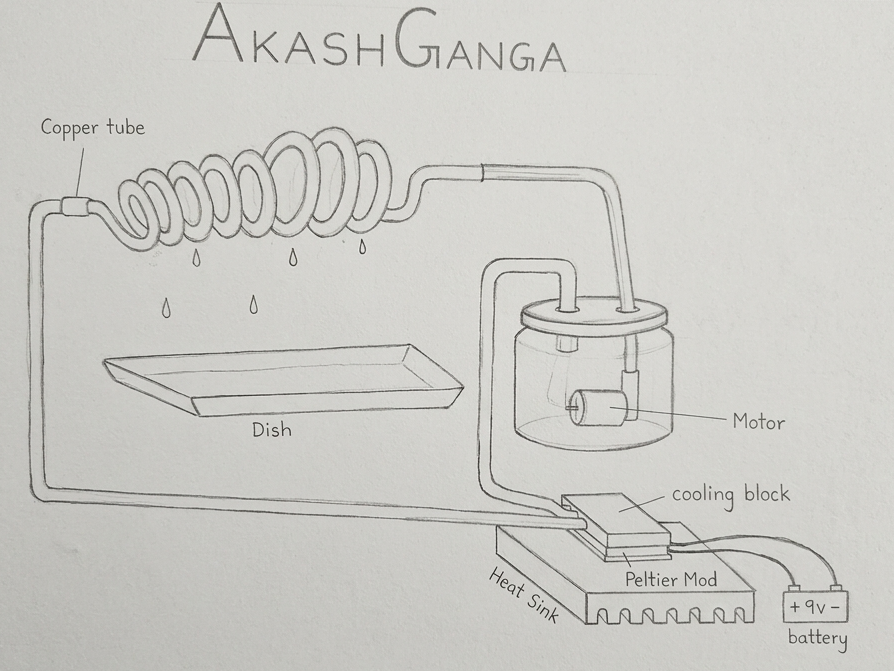 Building a water harvesting device like "AKASH GANGA" using the listed components (Peltier module, motor pump, heat sink, exhaust fan, coiled copper tube, plastic box, and battery) involves creating a system that utilizes condensation to extract water from the air.